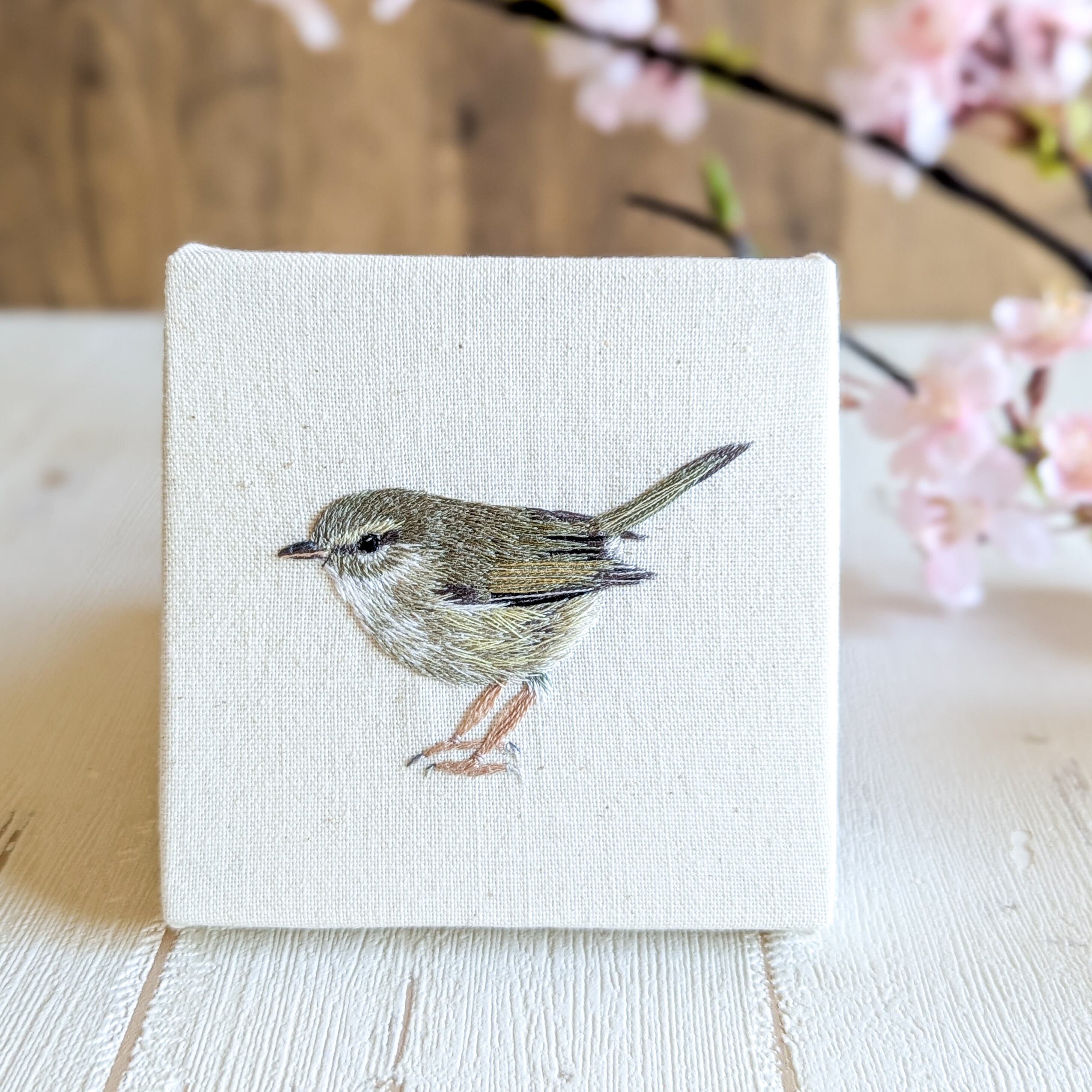 ウグイスの刺繍ファブリックパネル